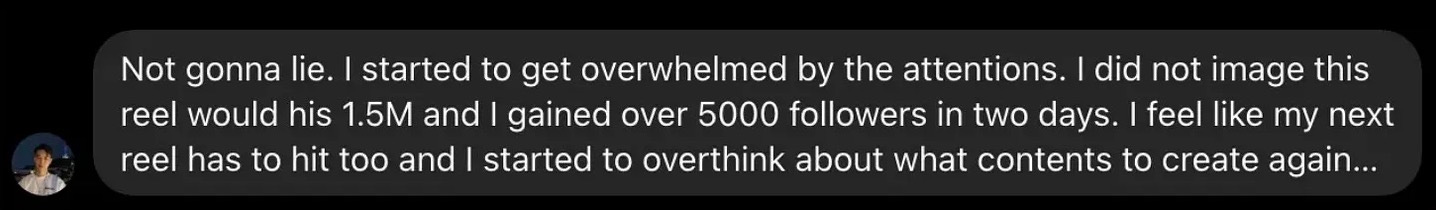 Attention. It’s pretty cool… but there will be times like “holy shit this is f*cking real”. It happens at smaller audience sizes than you’d think. One follower DM’d me about being recognized in public despite her page having under 10k followers.